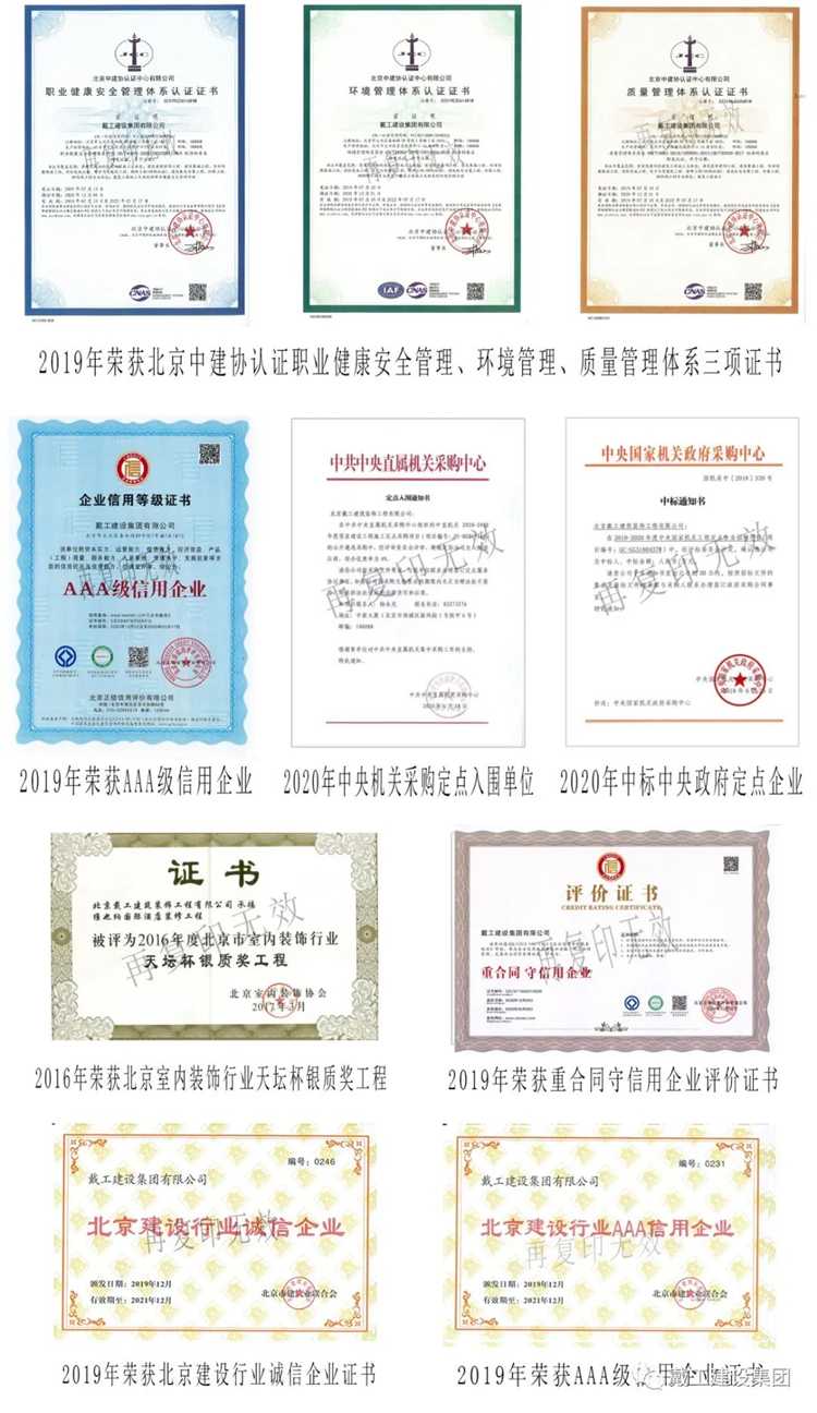 戴工建設集團有限公司系一家集裝飾設計、工程施工、材料配送、木門、地板、家具、 裝飾品開發(fā)為一體的裝飾企業(yè)。公司位于北京市大興區(qū)。具有建委頒發(fā)的建筑裝飾裝修專業(yè) 壹級、防水保溫工程專業(yè)壹級、建筑幕墻專業(yè)貳級、消防設施專業(yè)貳級、電子與智能化專業(yè) 貳級,特種工程(結構補強)專業(yè)不分等級、建筑機電安裝專業(yè)叁級、環(huán)保工程專業(yè)叁級、 鋼結構專業(yè)叁級、建筑工程總承包叁級、建筑裝飾工程設計專項乙級、中國展覽館協(xié)會展覽 陳列工程設計與施工一體化壹級資質和中國展覽館協(xié)會展覽工程企業(yè)資質。公司通過了GB/T19001,IS014001,GB/T/OHSAS 認證。主要從事辦公空間、餐飲酒店、商業(yè)空間、學校、 醫(yī)院、別墅、住宅等場所的裝修設計和施工。公司經(jīng)北京市工商管理局正式批準注冊、北京市建委審核認定,已取得國家正規(guī)資質, 為中國建筑裝飾協(xié)會、中國室內裝飾協(xié)會、北京室內裝飾協(xié)會、北京市建筑裝飾協(xié)會的會員 單位,誠信五星級單位、質量 AAA 級單位。多年來公司持續(xù)穩(wěn)步發(fā)展,下設財務部、綜合管理部、工程質量部、市場開發(fā)部、經(jīng)營 部、設計部和合同預算部七個部門。建立了從方案設計、工程施工、質量監(jiān)督到售后服務等 一整套細致合理的服務流程體系。由經(jīng)驗豐富、時尚創(chuàng)新的設計精英;正規(guī)培訓、技藝嫻熟 的南方技工;資深專業(yè)的管理人員共同組建成一支誠信、敬業(yè)、務實、創(chuàng)新的精英團隊。先 進的辦公及施工、檢測設備;人文、科學的企業(yè)管理模式,為工程質量和公司發(fā)展提供了有 力的保障。公司以先進的設計理念、精深的設計功底為先導,以規(guī)范的管理、精湛的施工技術為基 礎,以完善的服務體系為依托,以產(chǎn)業(yè)化模式經(jīng)營降低成本為優(yōu)勢,為客戶提供專業(yè)化、人 性化、個性化的裝修產(chǎn)品和服務,并不懈努力以提升和超越客戶的消費價值。面對激烈的市場競爭,公司全體員工一直秉承“以質量求生存,以服務求發(fā)展”的經(jīng)營 理念,“客戶的滿意是我們工作的唯一標準”,始終堅持以客戶的需求和滿意為核心,從而使 公司不斷發(fā)展壯大,并贏得了較大的市場份額,成為裝飾行業(yè)中的佼佼者。公司將一如既往的致力于為社會各界提供更完善、更完美的裝修服務,精心鑄造“戴工” 品牌!并愿與業(yè)界同仁攜手,共建行業(yè)自律,維護市場環(huán)境,樹立行業(yè)新風,推動行業(yè)發(fā)展, 引領裝修新潮流,構建和諧社會之和諧裝修新篇章!